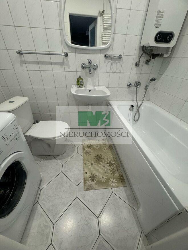 łazienki z wanną, umywalką i WC, w łazience pralka. Na podłogach